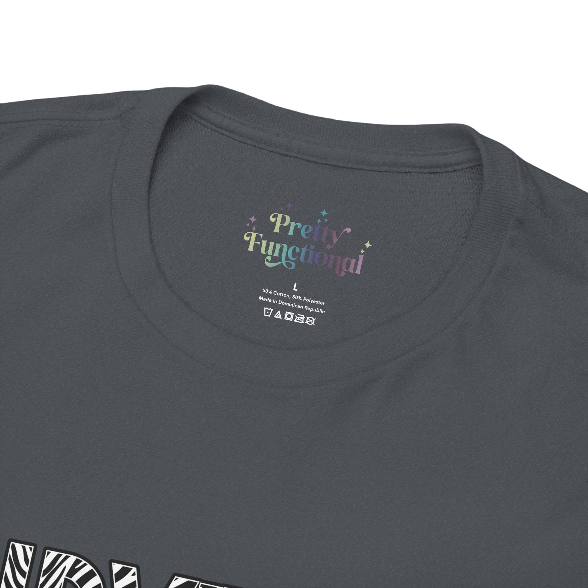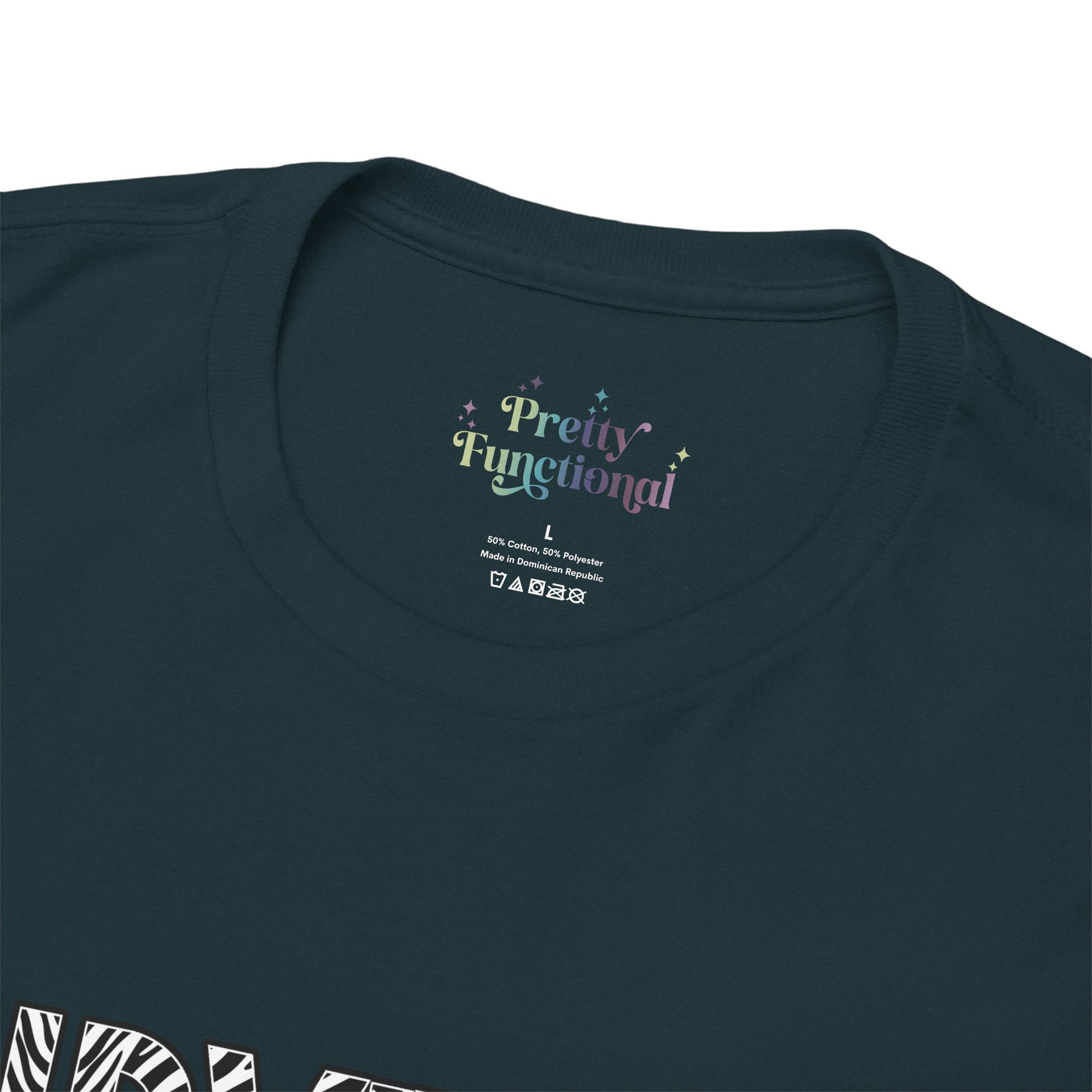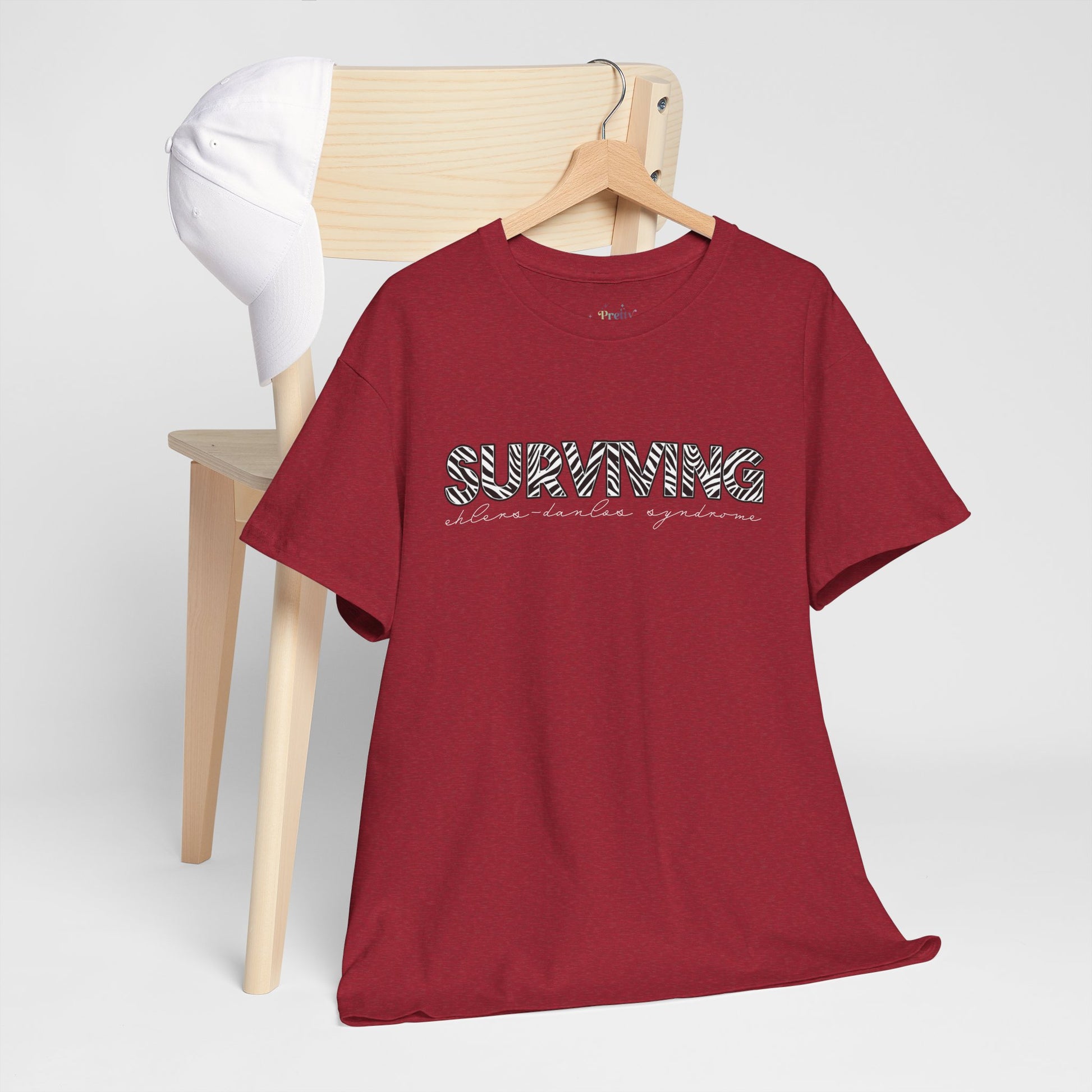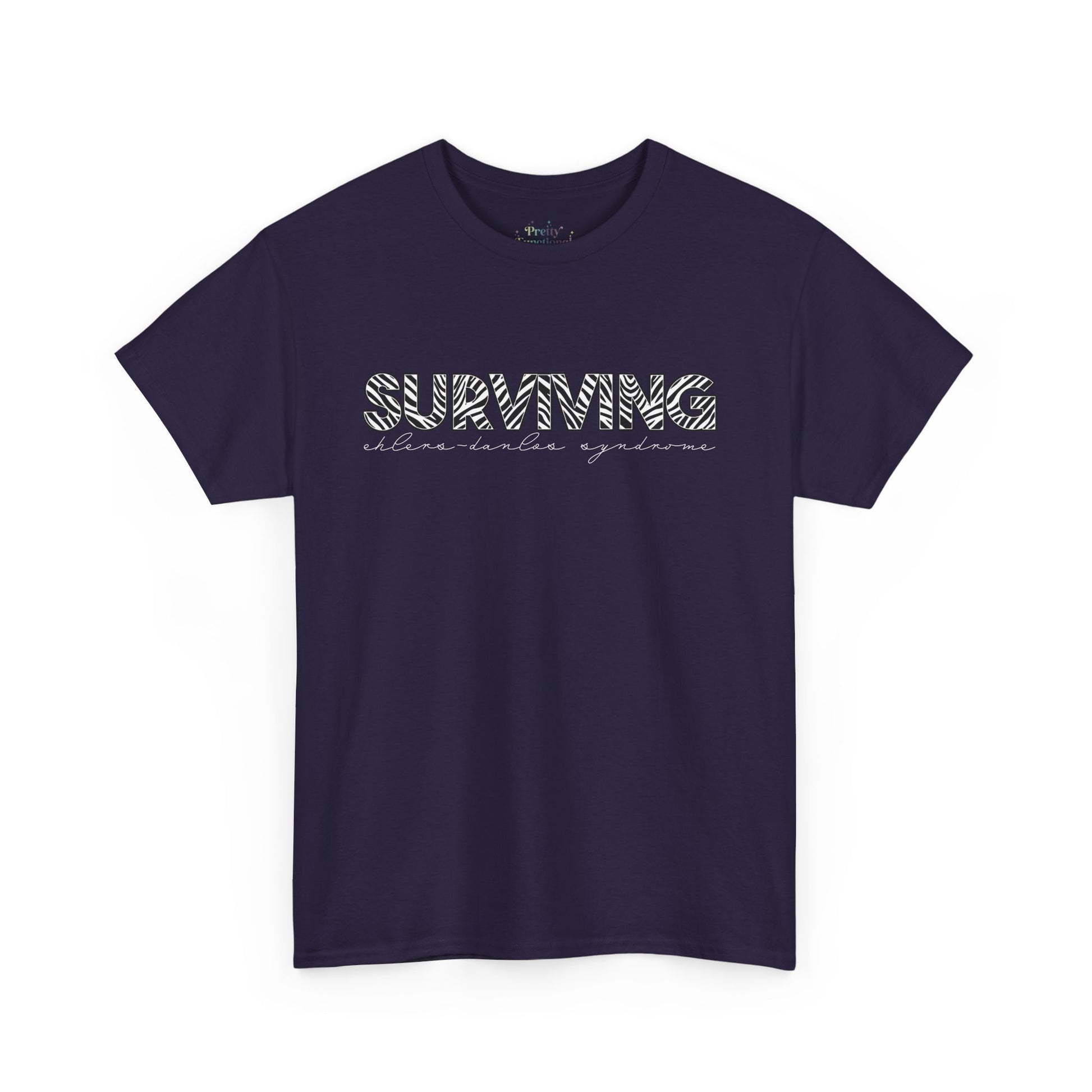 This shirt features the empowering phrase “Surviving Ehlers-Danlos Syndrome” in bold, high-contrast lettering across the chest. The main word “Surviving” is large and commanding, symbolizing resilience and strength, while “Ehlers-Danlos Syndrome” appears below in a sleek, script font for balance. The zebra stripe pattern — the recognized symbol for EDS awareness — weaves through parts of the lettering, adding texture and meaning without overwhelming the design. This design blends strength, awareness, and style, making it suitable for both everyday wear and advocacy events.