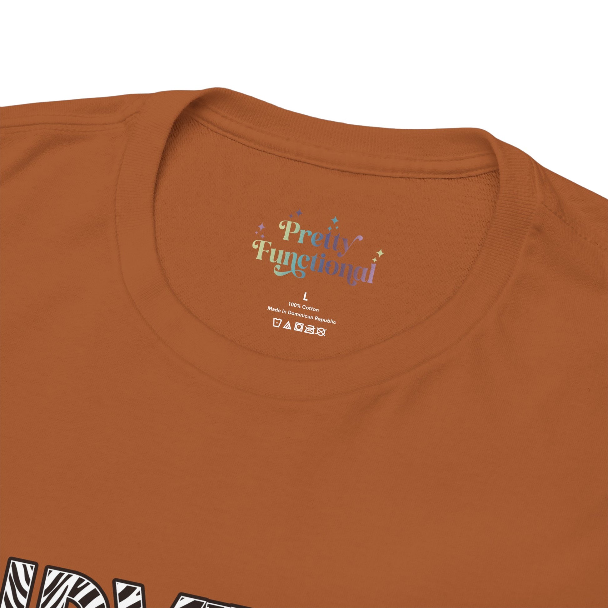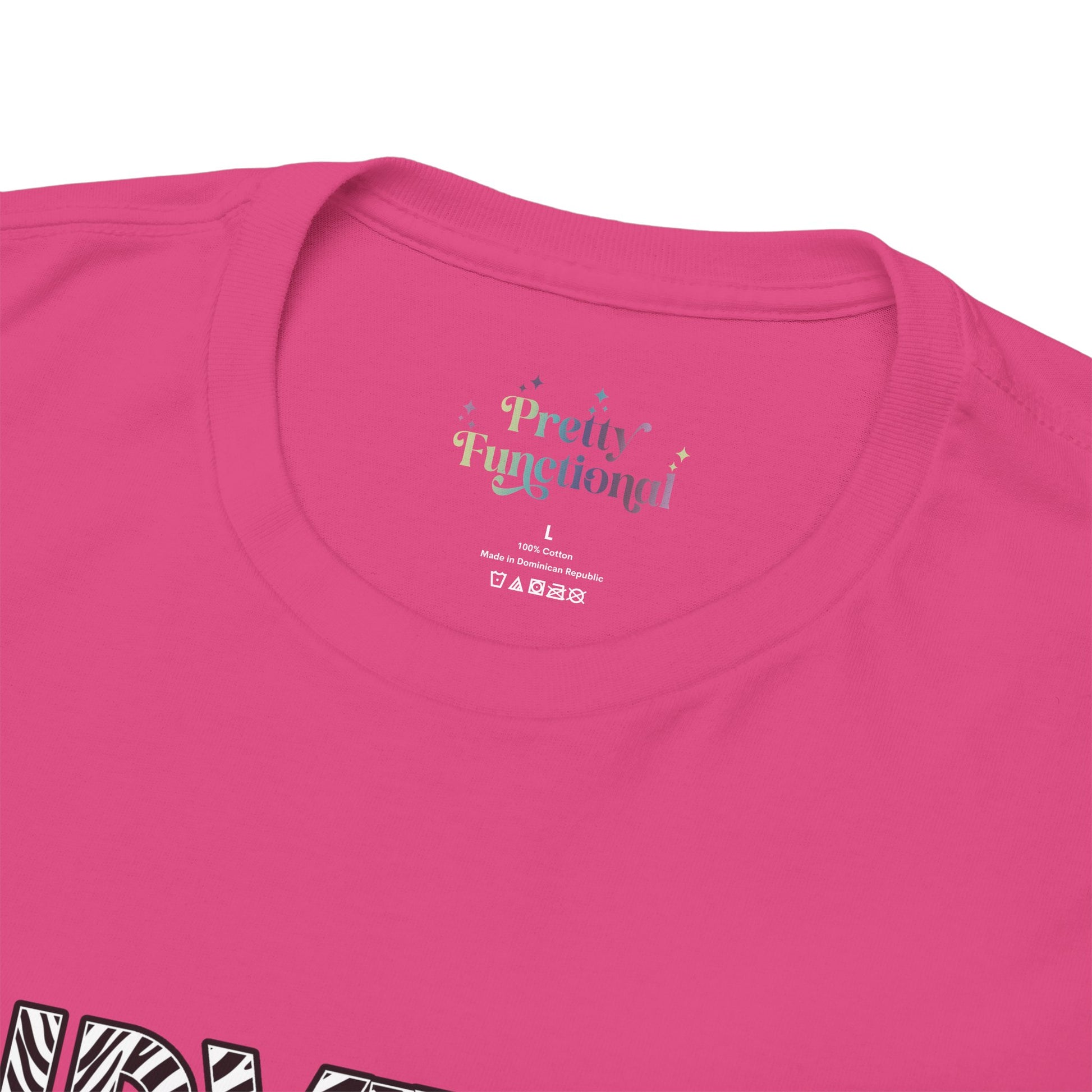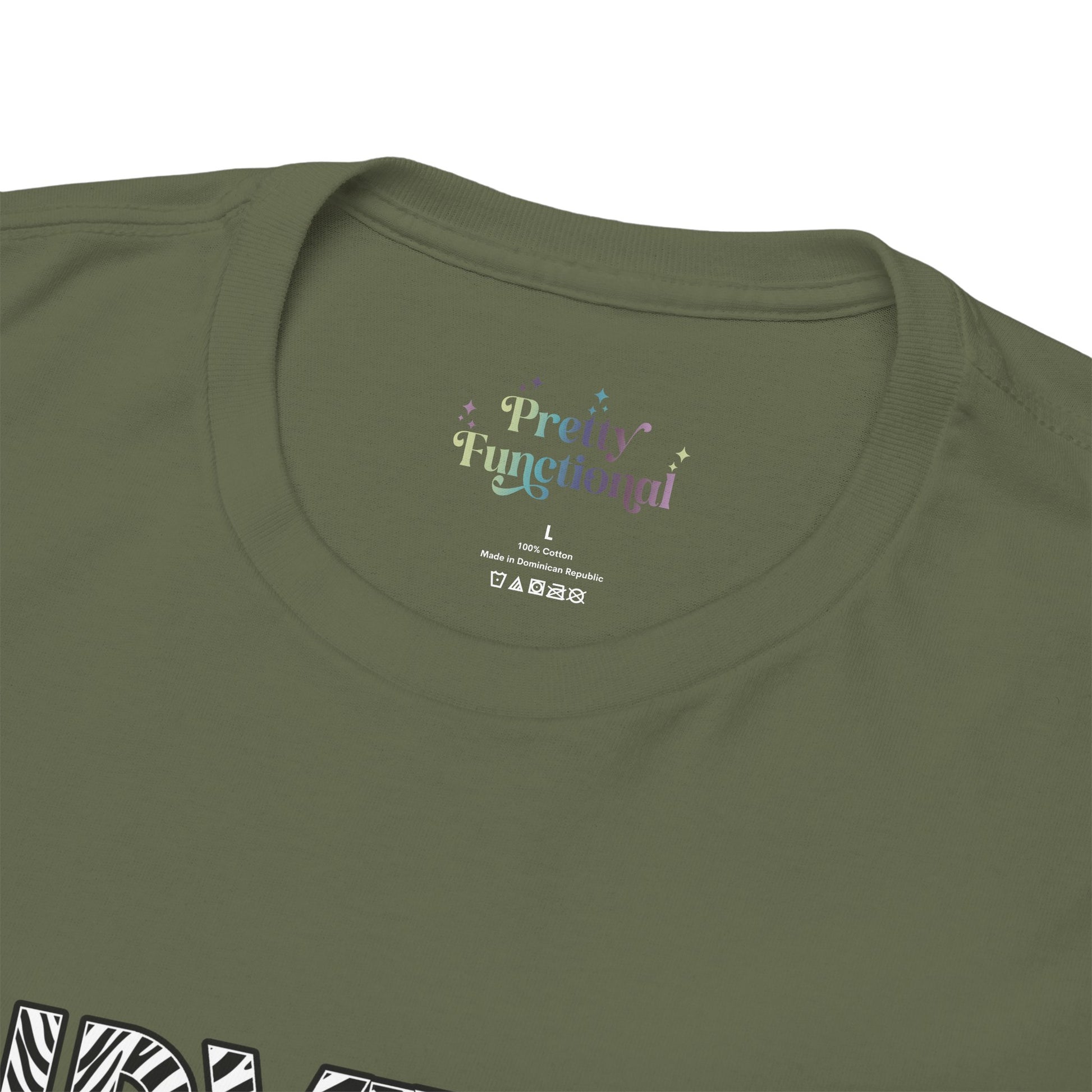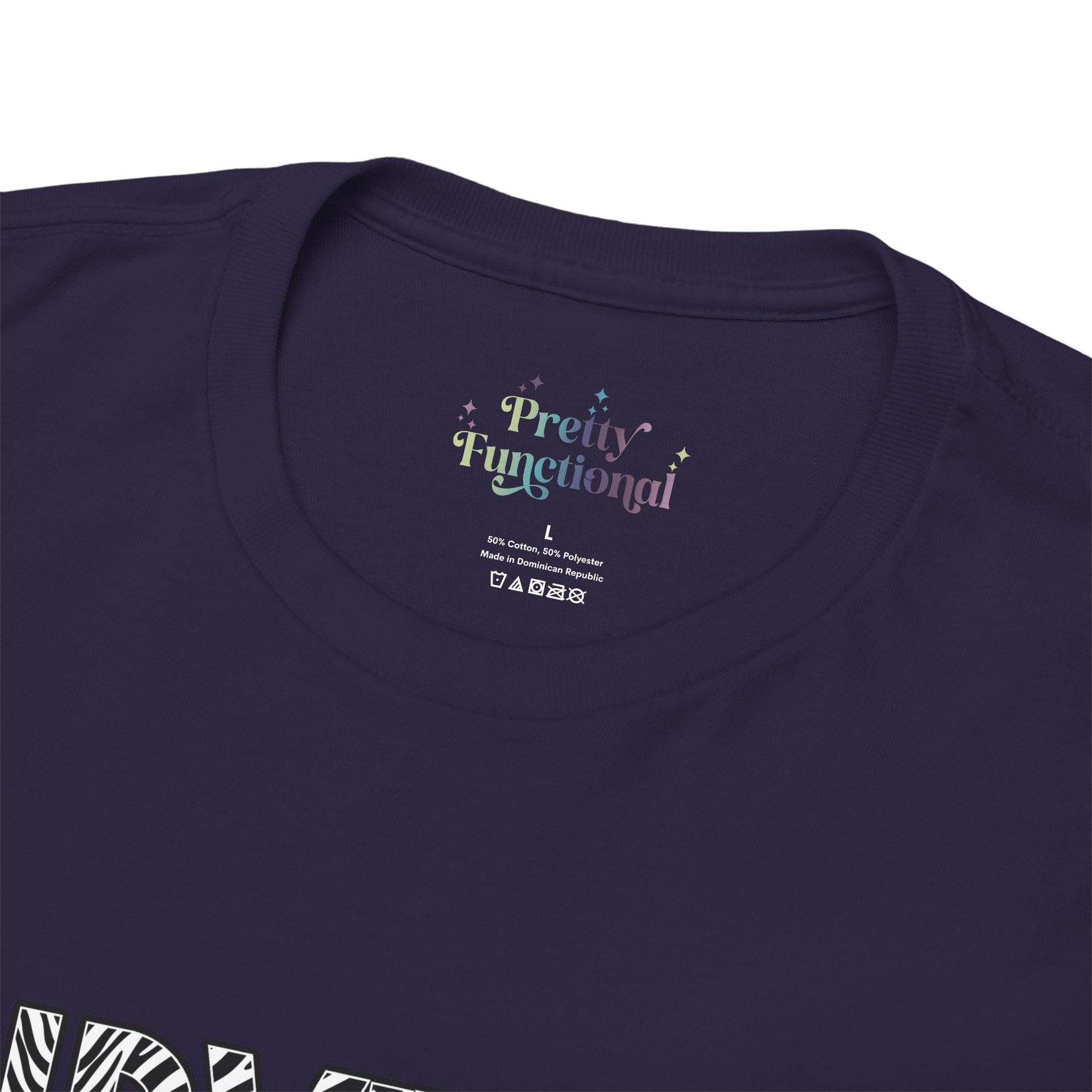 This shirt features the empowering phrase “Surviving Ehlers-Danlos Syndrome” in bold, high-contrast lettering across the chest. The main word “Surviving” is large and commanding, symbolizing resilience and strength, while “Ehlers-Danlos Syndrome” appears below in a sleek, script font for balance. The zebra stripe pattern — the recognized symbol for EDS awareness — weaves through parts of the lettering, adding texture and meaning without overwhelming the design. This design blends strength, awareness, and style, making it suitable for both everyday wear and advocacy events.